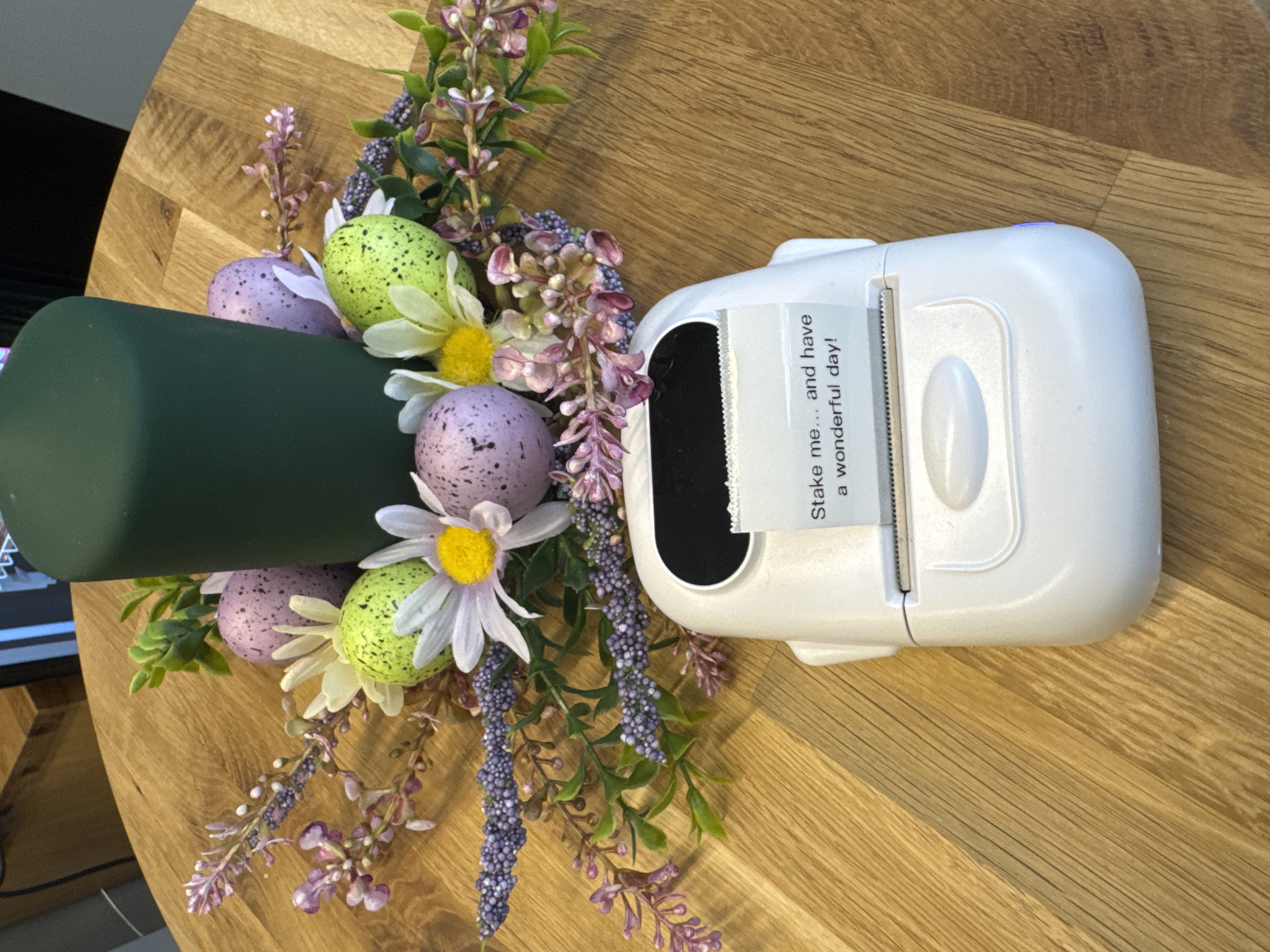 A close-up shot reveals a floral centerpiece on a round wooden table. The centerpiece features speckled Easter eggs in purple and lime green, interspersed with daisy-like flowers. Green stems and sprigs of purple flowers complete the arrangement, which is wrapped around a cylindrical green container. Next to the arrangement is a white, rectangular tape dispenser. A small piece of tape is protruding from the dispenser, with the text "Take me... and have a wonderful day!". The photo was not taken in Sofia, Bulgaria.