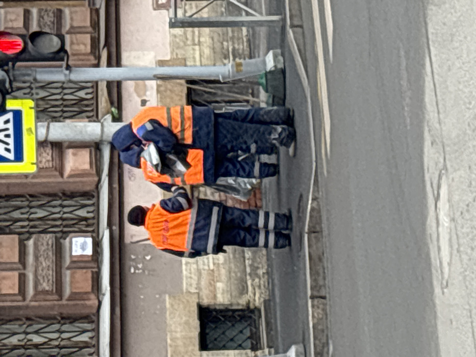 The image depicts an urban street scene in Saint Petersburg, Russia, during daylight. Three individuals, consistent with municipal workers, stand on a paved sidewalk against the backdrop of an ornate, weathered building. All three are dressed in dark blue work trousers and jackets, covered by bright orange high-visibility vests; the vest of the leftmost worker features white Cyrillic text. The two rightmost workers are clustered, with one facing away and the other mostly obscured, appearing to engage with or inspect an object wrapped in light material, possibly a document or collected item. The third worker, to the left, stands observing the general area. The background consists of a multi-story building with a brown-orange facade, featuring decorative stone panels and metal grilles on its lower-level windows. A small white sticker with a blue emblem and unreadable Cyrillic text is affixed to the building wall above the workers. Adjacent to the workers, a grey pole holds a yellow square pedestrian crossing sign with a blue symbol and a traffic light displaying a red signal. A green-handled broom is visible, leaning against the pole. The foreground reveals an asphalt street with a circular manhole cover and partially visible white stripes of a pedestrian crossing.