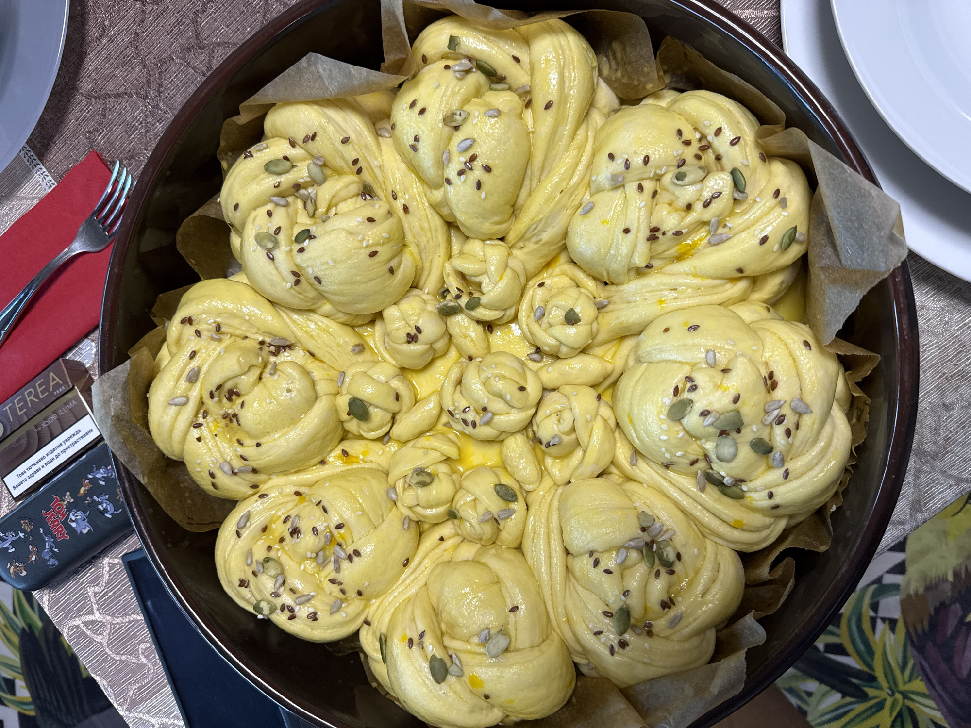 The image captures a partially prepared pastry inside a round baking pan lined with parchment paper. The pastry features a decorative arrangement of braided and knotted dough balls, sprinkled with a mix of seeds, including sunflower and pumpkin seeds. To the left of the baking pan, there is a place setting with a fork and a red napkin. Also visible is a pack of "TEREA" cigarettes for IQOS ILUMA, with a "Tom and Jerry" case. The photo has been taken in Burgas, Bulgaria. The background includes a patterned tablecloth and parts of plates and furniture, suggesting this is a domestic or dining setting.