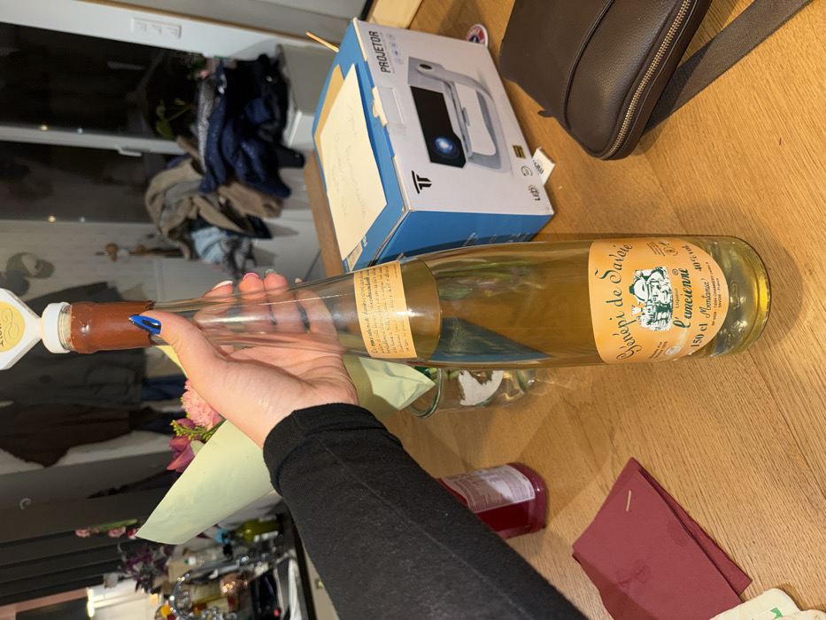 A hand holds a bottle of Génépi de Savoie liqueur. The bottle has a long neck and a yellowish liquid inside. It lies horizontally on a wooden surface next to a projector box and a brown bag. A bouquet of flowers and other objects are visible near the bottom of the frame. The background shows a doorway with cluttered items inside. The hand has a dark sleeve and is decorated with blue nail polish.