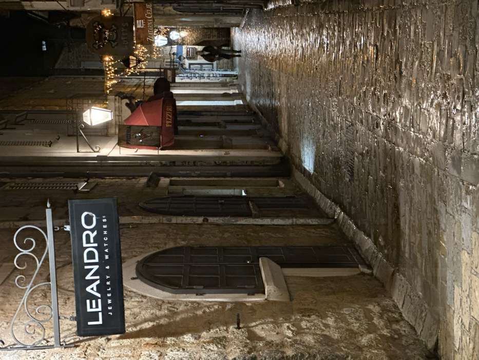A narrow, upward-sloping European alleyway at night. A stone pathway reflects light. On the left, a "Leandro Jewelry & Watches" sign hangs near arched windows. Above, steps lead to a restaurant marked by a red umbrella and signage. People walk in the distance, illuminated by string lights and shopfronts bearing names like "Lotty's". The weathered stone walls enclose the scene, capturing a European cityscape vibe.