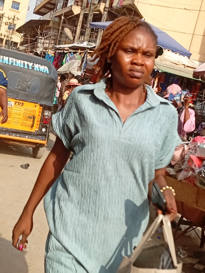 The image depicts an outdoor scene in Fegge, Nigeria, characterized by a bustling commercial street or market environment under bright daylight. In the foreground, a woman of African descent, with light brown braided hair and dark skin, walks towards the viewer's right. She is wearing a light blue, short-sleeved collared dress with a textured, vertically ridged fabric. Her facial expression appears neutral to stern, with a slight furrow in her brow. Her left hand holds a small, indistinct object, and her fingernails are painted red. Her right hand holds a dark-colored smartphone and a beige reusable shopping bag, which contains dark items. A gold-colored beaded bracelet is visible on her right wrist. To the left of the woman, a portion of a yellow and black three-wheeled auto-rickshaw is visible, featuring the text "INFINITY NWA" in blue capital letters on its side. Part of an individual's arm in a blue shirt is visible next to the rickshaw. The ground beneath appears to be a light-colored, possibly paved or dusty, surface. The background reveals a dense urban setting composed of multiple multi-story buildings. Numerous market stalls are set up, displaying various goods such as clothing and bags. A dark blue canopy covers a section of these stalls. Several other individuals are present in the background, largely obscured by the market activity and distance.