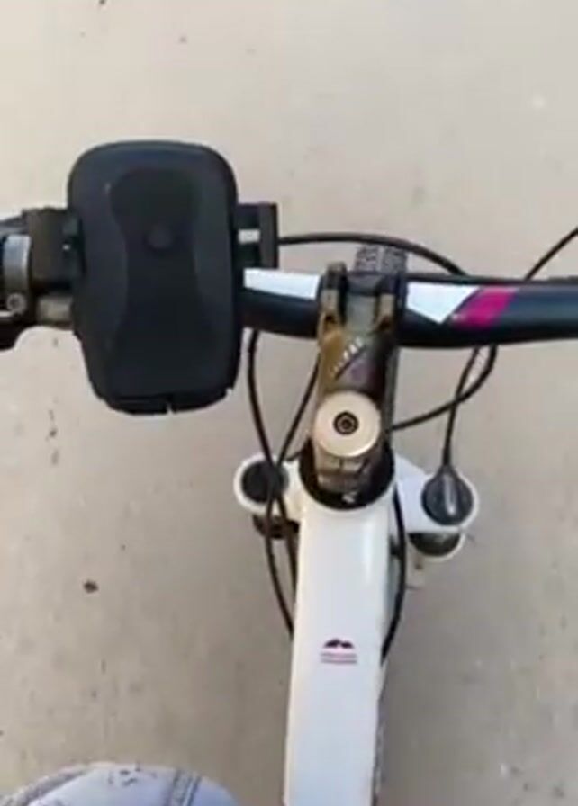 first-person perspective of someone riding a bicycle down a narrow street in a residential area