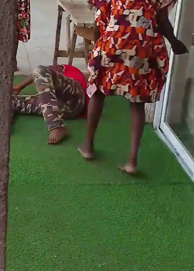 The scene captures three individuals outdoors, likely children, on a patch of artificial green turf. One person, clad in camouflage pants and a red shirt, is lying on the turf, motionless. Two other individuals, both barefoot and wearing colorful dresses, stand near the person on the ground. One child in a floral dress appears to be dancing or spinning, while the other in a patterned dress stands nearby. Behind them, a simple wooden stool is visible. The scene is framed by a section of wall to the left and a glass door or window to the right.