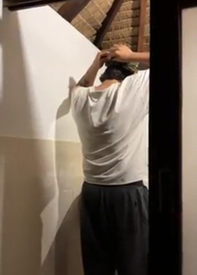 A man wearing a white t-shirt and dark sweatpants is shown from the back, standing inside a small tiled bathroom. He is securing a dark-colored head covering to his head. The bathroom has a white wall, light-colored tiles, and a dark ceiling with a thatched roof visible. A partially open dark door frame is on the right of the frame. A shelf holding a black bag can be seen under the man's arms. The ambient lighting is warm and the music is playing.