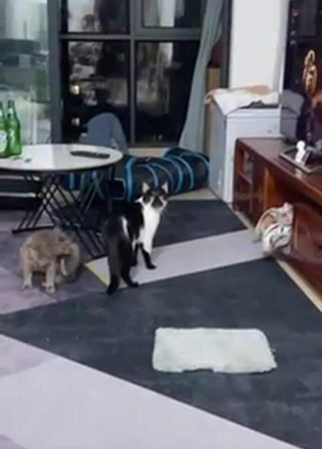 two cats in an indoor setting. One cat, a gray tabby, sits near a small table, while a black and white cat stands nearby. The black and white cat then moves towards a wooden television cabinet, retrieves a small object, and drops it on a geometric patterned rug. The rug is gray, black, and white. In the background, there are patio doors with a view of a city at night, a cat tunnel, and other furniture.