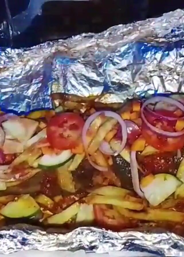 A grilled fish covered in a red sauce and garnished with red onion slices, zucchini, and tomato slices is laid out on a foil-covered surface, being uncovered by a hand