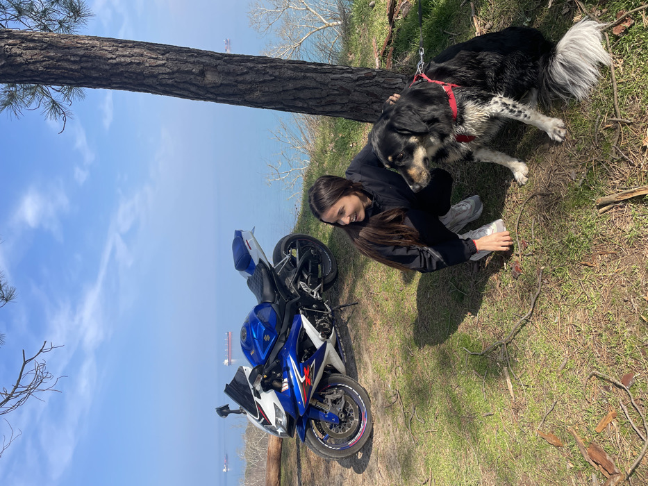 The image depicts an outdoor scene on a sunny day at an elevated coastal point overlooking the Black Sea in Varna, Bulgaria. In the foreground, an adult female with long dark hair, wearing a black athletic jacket, black trousers, and light-colored sneakers, crouches on a patch of green and brown grassy ground. She is positioned to the right of a blue and white Suzuki GSX-R sport motorcycle, which is parked on its kickstand. The woman smiles, looking towards the right side of the frame, with her right hand near a medium-to-large dog seated beside her. The dog is predominantly black with white and brown markings, featuring a white and black spotted pattern on its rear left leg and a bushy, light grey/white tail. It wears a red harness and a visible red leash, looking towards the right. A thick, textured tree trunk, characteristic of a pine, stands vertically on the far right of the frame, with branches extending upwards. In the background, the calm, light blue waters of the Black Sea stretch to the horizon under a clear sky with sparse, wispy white clouds. At least three cargo ships are visible in the distance on the sea. The ground is a mix of grass and dirt, with scattered twigs and tree shadows.