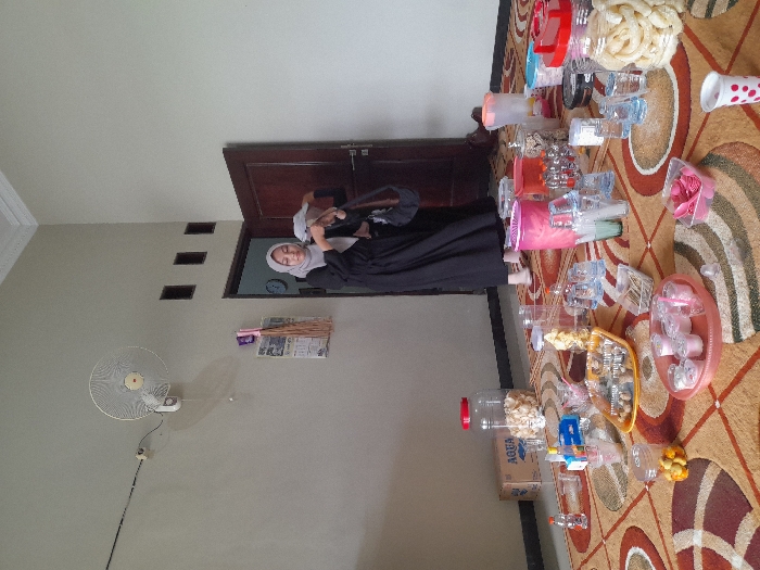 The image depicts an indoor scene within a building in Ketegan, Indonesia. The floor is covered by a patterned rug featuring interwoven brown, orange, and off-white geometric designs. Spread across the rug are numerous plastic containers holding food and beverages, including clear plastic drinking cups, various plastic pitchers, multiple clear jars filled with snacks such as white fried crackers and small yellow spherical items, and plastic trays containing individual dessert portions and cutlery. In the background, a woman stands positioned within a partially open dark brown wooden doorway. She wears a light-colored hijab and a long black dress, and is actively manipulating a white cloth object with both hands. A wall-mounted oscillating fan with visible wiring is fixed to the light gray wall on the left. Above the doorway, three dark rectangular vents are visible. A cardboard box labeled "AQUA" and a large clear jar of snacks are visible on the floor in the left background. A small purple wall-mounted organizer with hanging items is visible to the left of the doorway.