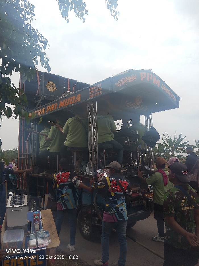 The image captures an outdoor event in Wanguk, Indonesia, at 10:02 AM on October 22, 2025, under an overcast sky. The central element is a dark-colored, modified vehicle, likely a truck or float, configured as a mobile stage. It features a prominent sound system with multiple large, stacked black speakers, one displaying a circular gold emblem. A black canopy, supported by chrome poles, covers the stage area and is adorned with orange decorative swirls. The canopy displays the text "PUTRA PAI MUDA" on the side, "PPM" on the front, and the phone number "082316223378." Additional Indonesian text is visible, listing services such as "SOUND SYSTEM" and "ELECTON." On the elevated mobile stage, at least five individuals are present, wearing identical light green short-sleeved shirts. Two are actively holding string instruments, indicating their role as musicians. Another individual is seated further back, potentially operating sound equipment. Around the vehicle at ground level, several people are observed. In the foreground left, a vendor operates a small white cart with a multi-mold cooking surface, alongside a wooden stand holding plastic containers, sachets of condiments, and wrapped food items. Two men in the mid-ground wear distinctive colorful long-sleeved shirts featuring racing-style graphics and the number "#19." Other individuals, including one in a light green shirt and a baseball cap, and another in a camouflage-patterned shirt and dark baseball cap, are positioned as spectators. The background right reveals additional individuals and tropical vegetation, including what appears to be banana trees. The scene depicts a community gathering or performance centered around the mobile stage.