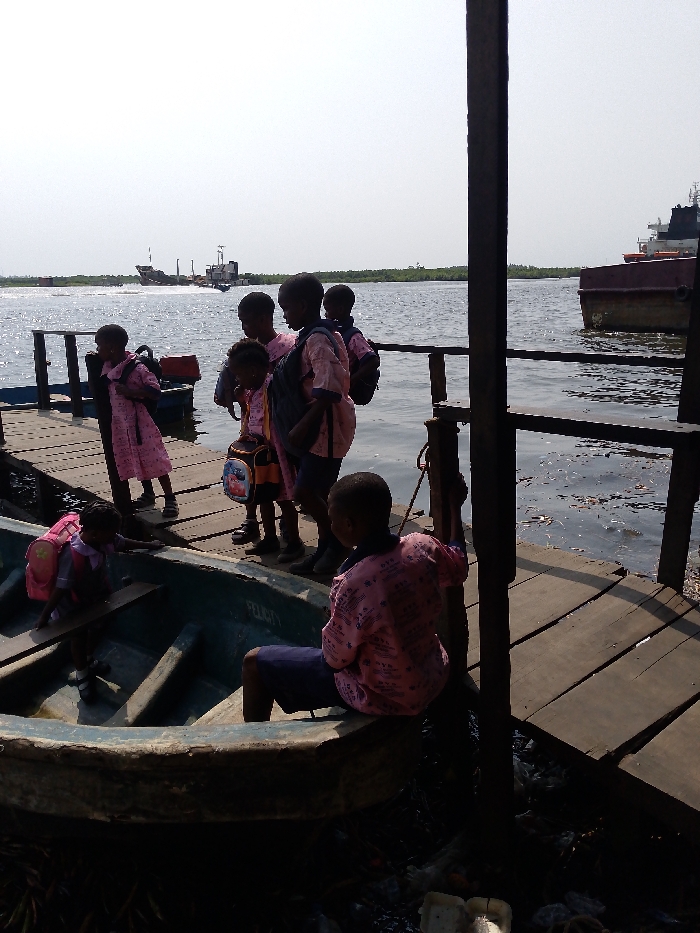 The image depicts a group of primary school children engaging in water transportation along a wooden jetty, likely on the Lagos Lagoon or one of its connecting creeks in Lagos, Nigeria