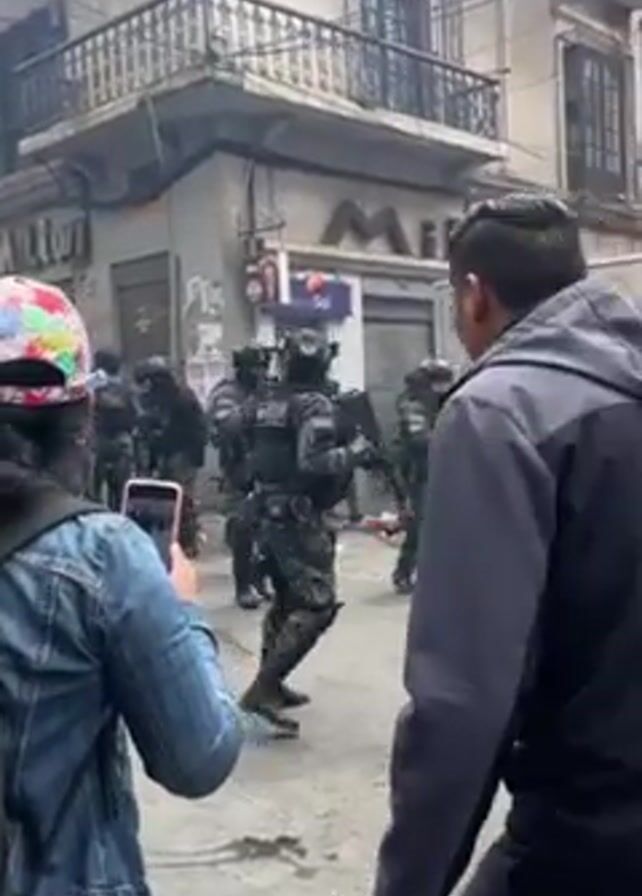 The video depicts a street scene with heavily armed police officers, equipped with riot gear and weapons, moving through the area. Some officers are seen running towards a barricade, while others maintain a presence in the street. There is trash and debris scattered on the ground. Civilians can be seen observing and recording the events with their phones. The buildings surrounding the street appear to be in an urban setting, with some architectural details like balconies and awnings. The overall atmosphere suggests a tense or confrontational situation.