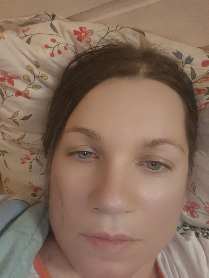 A close-up, eye-level portrait displays a light-skinned individual, likely female, with dark brown hair and light blue-grey eyes, located indoors in Свистуха (кузяевский С/о), Russia. The subject is positioned lying down, looking directly into the camera with a neutral expression. Her hair is parted slightly off-center. She is wearing a white garment, possibly with an orange-red trim visible near the bottom left, and a light blue fabric, potentially a blanket or additional clothing, is visible to her left. Her head rests on a light-colored pillow case adorned with a repeating floral pattern featuring red flowers, blue buds, and green leaves on stems. The lighting appears soft and diffused, illuminating the subject's face evenly.