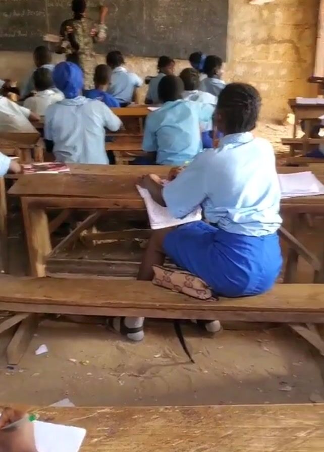 classroom setting, presumably in an African country. Students, wearing light blue shirts and dark blue skirts or pants, are sitting at wooden desks and benches. They are taking notes as a teacher stands at the blackboard, writing. The classroom has brick walls and a window with bars. The desks appear old and well-worn, and there's some paper debris on the floor. A student's hand is visible in the foreground, writing in a notebook. The teacher is wearing a patterned outfit and is facing the blackboard. The blackboard has handwritten notes in English.