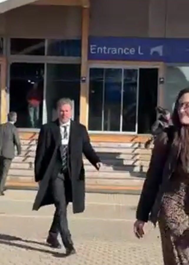 Matt Damon walking outdoors at a venue labeled "Kurpark." He's wearing a dark overcoat, suit, tie, and a lanyard around his neck. He walks on a stone-paved area. In the background, other people are walking, including a woman in a leopard print dress and a person with a camera. The venue has modern architecture with wooden accents and a sign indicating "Entrance L" for the "World Economic Forum Annual Meeting Davos 2026." The lighting suggests a bright, sunny day.