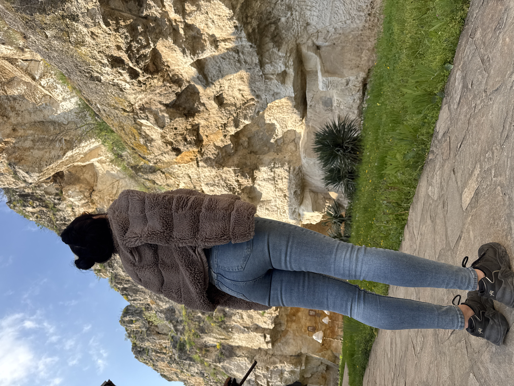 person with dark hair, wearing a brown fuzzy jacket and blue jeans, standing on a stone pathway. The person is facing away from the camera. In the background, there is a rock face with green vegetation. The location is Basarbovo, Bulgaria.