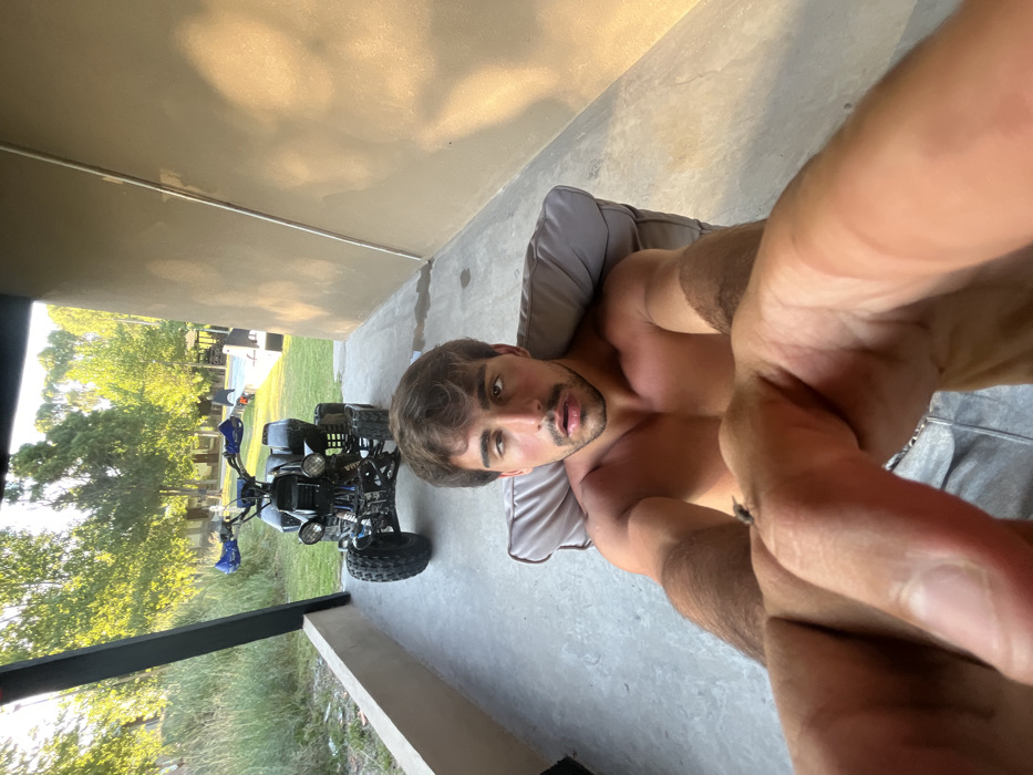 A shirtless man reclines on a gray cushion, facing the camera. His hand is positioned close to the lens, slightly obscuring the view. Behind him, an ATV is parked on a concrete surface. Beyond the ATV, there's a glimpse of green grass and trees. The image appears to be taken in an outdoor or semi-outdoor setting, possibly a patio or veranda, with a beige wall visible in the background. The light appears to be natural and diffused.