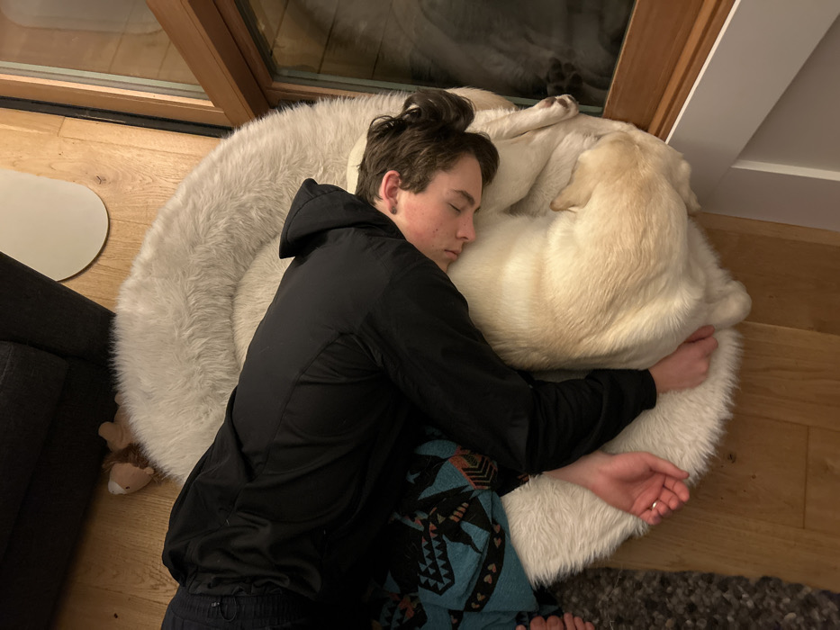 - "A young man wearing a black hooded jacket and patterned pants is asleep on a fluffy white dog bed, embracing a yellow Labrador Retriever" by FM-p02Wp2, licensed under CC BY 4.0