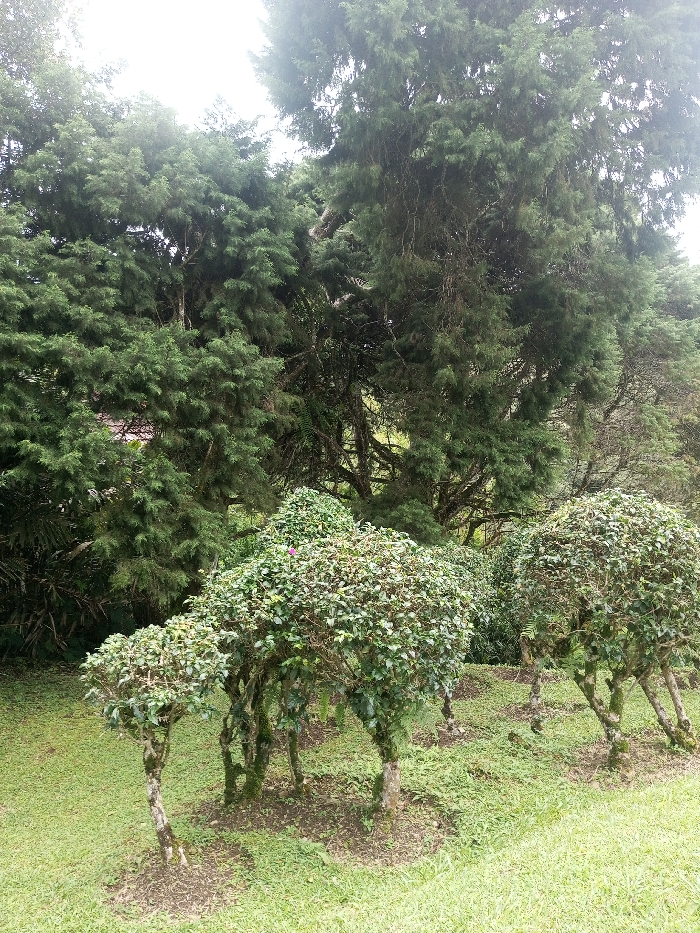 The scene depicts a vegetated outdoor area in Kanand, India. In the foreground, a grassy slope is visible, interspersed with patches of exposed brown soil. Several small, cultivated shrubs with visible, moss-covered trunks and dense green foliage are present, appearing to be shaped or pruned. One shrub in the central foreground exhibits a single small pink bloom. The midground and background are dominated by a dense array of numerous large evergreen trees with thick, dark green canopies and visible branches. The upper portion of the image shows an overcast, light-colored sky partially obscured by the tree line. No people, animals, or explicit actions are observed within the frame.