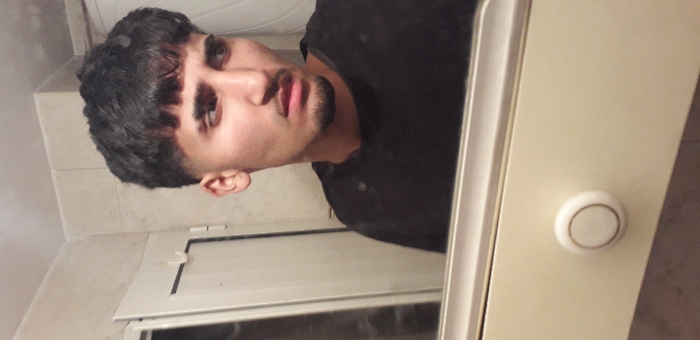 - "A young adult male, appearing of Middle Eastern or Mediterranean descent, with short dark hair styled with a faded taper and a front fringe, dark eyes, prominent eyebrows, and a short, dark goatee, is captured in a mirror reflection" by FM-hmoFD3, licensed under CC BY 4.0