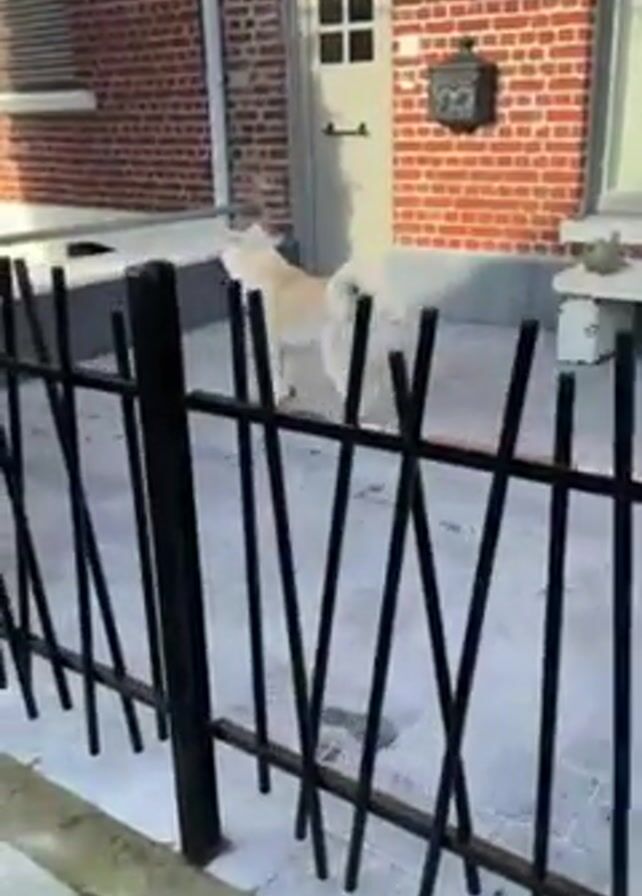 A short video shows a cream-colored dog standing outside a brick house behind a black metal fence