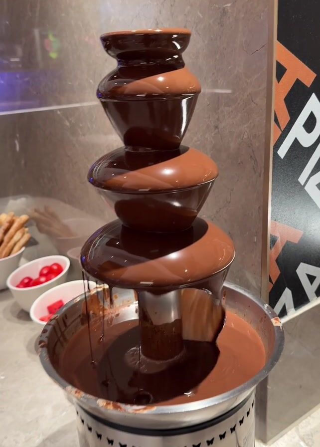 A chocolate fountain is the central focus of the shot, with four tiers of flowing chocolate