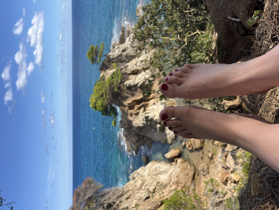 The image depicts a first-person perspective overlooking a coastal scene near Lloret de Mar, Spain, specifically an area characterized by rocky cliffs and the Mediterranean Sea. In the immediate foreground, a pair of bare human feet, exhibiting dark red nail polish on all ten visible toes, extend forward over a rocky, earthy precipice. The feet display a fair complexion. The background reveals a expansive seascape. The Mediterranean Sea dominates, transitioning from deep blue on the horizon to vibrant turquoise closer to the shore, indicating shallow, clear water. A prominent rocky islet, heavily vegetated with several green pine trees, is centrally located in the midground. Waves are observed gently breaking against its base. To the left of this islet, rugged cliffs descend into a small cove featuring calm, clear water and visible submerged rocks. Sparse, dry coastal vegetation is present on the surrounding cliffs, with a gnarled tree branch partially visible in the upper left of the frame. The sky above is clear blue with scattered white cumulus clouds. A small yellow marker buoy is discernible on the sea surface in the mid-distance. The scene is illuminated by bright natural sunlight, indicating clear weather.