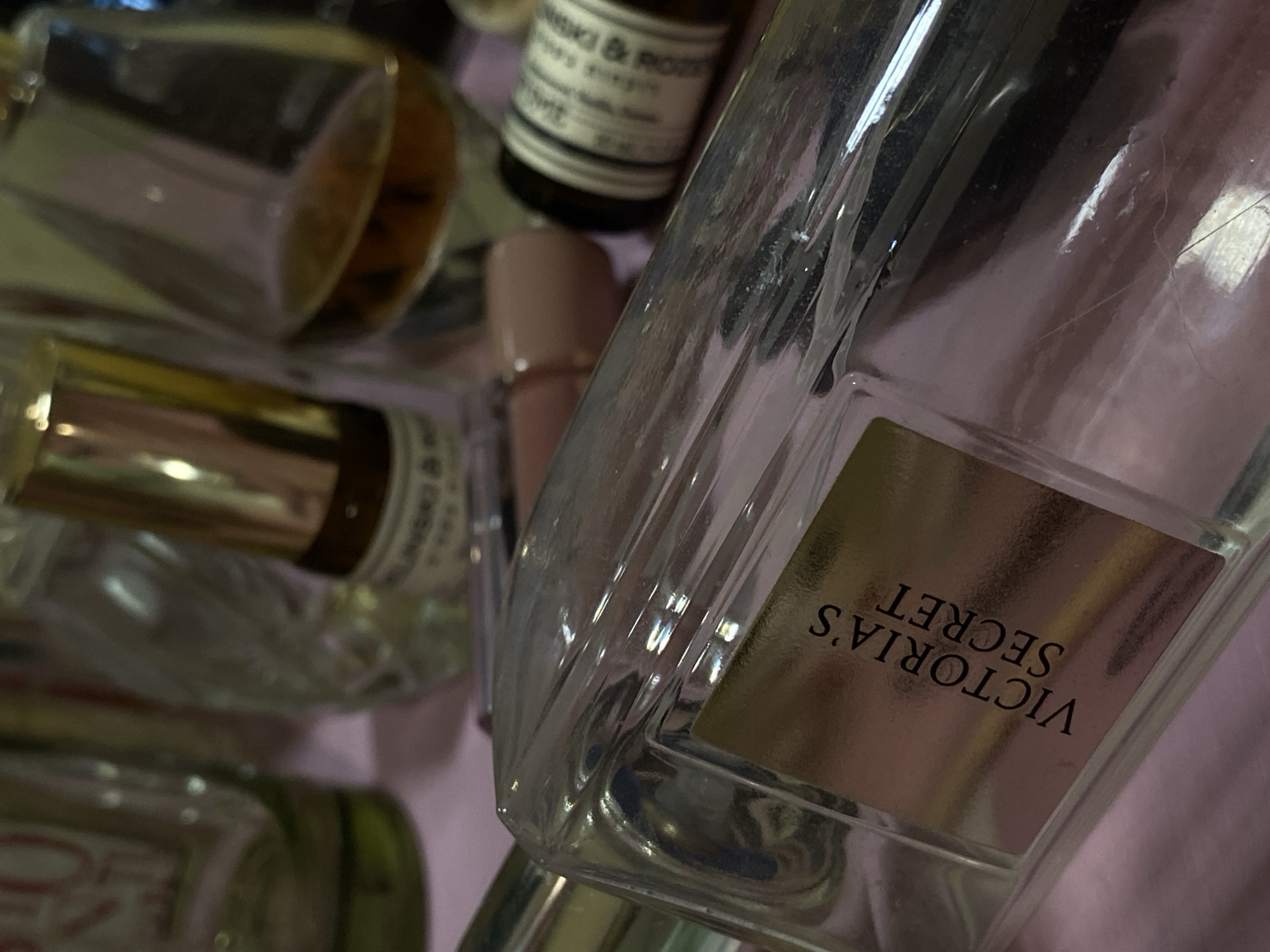 close-up, slightly angled view of several cosmetic or fragrance items. Dominating the frame on the right is a clear glass bottle with a gold-toned label reading "VICTORIA'S SECRET" in black lettering. Several other bottles, some clear with gold accents and others with dark brown labels, are seen in the background, out of focus and partially obscured. The bottles are arranged on a pale pink surface, which appears to be fabric. There is no information about the location of the photograph in Votkinsk, Russia.