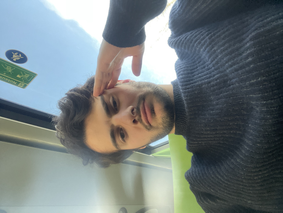 This image captures a young adult male inside a vehicle, located in the city of Bezannes, France. The subject, viewed from the chest up, has dark, wavy hair, a light beard, and is wearing a dark, ribbed mock-neck sweater. He looks forward with a neutral expression, his right hand raised with fingers extended horizontally across his forehead. To the subject's left, a light green seat back is visible. Above the subject, a window displays a clear blue sky with minimal white clouds. Affixed to the window are two stickers: a green rectangular decal marked "Notaus" (German for "Emergency Exit") with white pictograms illustrating emergency procedures, and a blue circular decal featuring a white pictogram. The interior details suggest a public transportation environment, such as a train or tram.
