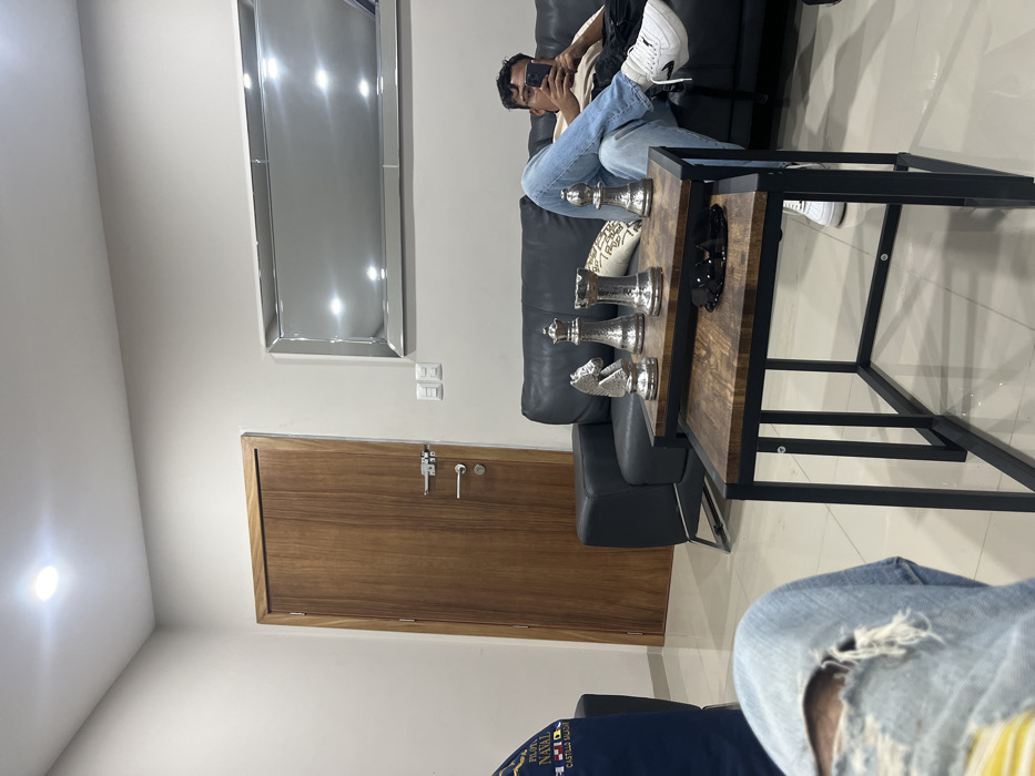 An indoor scene in Veracruz, Mexico, depicts a modern living area. The room features light-colored walls and a light-tiled floor. A wooden door with a silver handle and deadbolt is visible on the left wall. Above a dark-colored, possibly leather, sofa on the right, a large, rectangular mirror with a reflective, beveled frame is mounted. Two white electrical outlets/switches are located on the wall between the door and the mirror. In the foreground, the lower body of one individual is partially visible on the left, wearing light blue ripped jeans, a dark blue shirt with "PILOTA NAVAL" text, and a yellow and white striped garment underneath. On the right, a male individual is seated on the dark sofa, leaning back with his legs extended. He is wearing a light-colored t-shirt, light blue ripped jeans, and white Nike athletic shoes. He wears eyeglasses and is actively looking at and holding a dark-colored smartphone with both hands. A black backpack is partially visible behind him on the sofa. In front of the sofa, two nesting tables with dark metal frames and distressed wooden tops are present. On the top table, four large, decorative, silver-colored chess pieces (knight, queen, rook, bishop) are arranged. A dark dish, possibly containing sunglasses, is also on the top table. A light-colored, patterned throw pillow is visible on the sofa behind the nesting tables. The ceiling features recessed lighting.