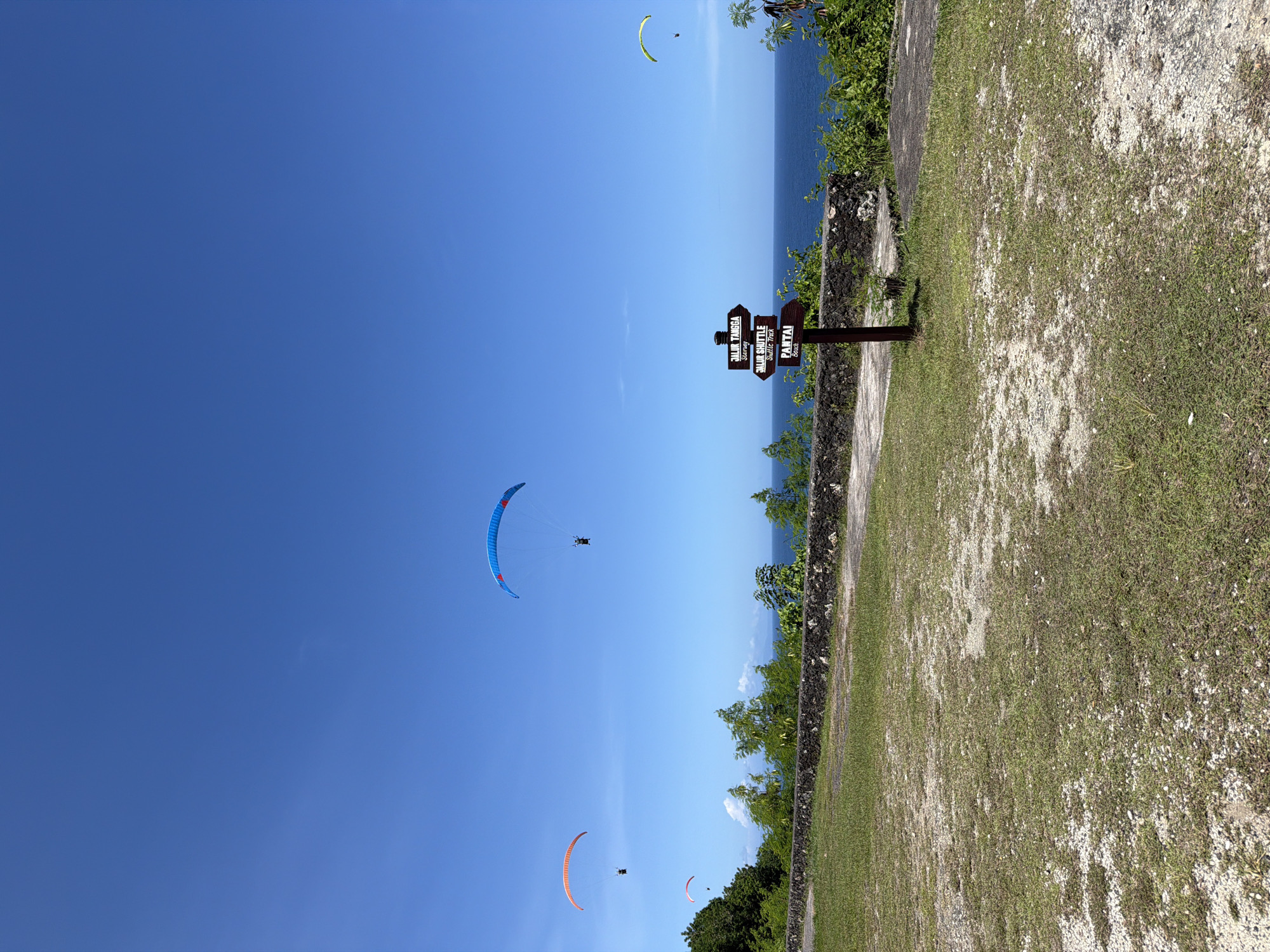 The image depicts a scene in Benoa, Indonesia, featuring paragliders in the sky. A brown wooden signpost stands near a grassy area, indicating directions to "Jalur Tangga," "Jalur Shuttle," and "Pantai." The sea and sky meet at the horizon, with a coastline visible. Several paragliders are scattered across the blue sky. A wall with greenery separates the grassy area from the coastal view.