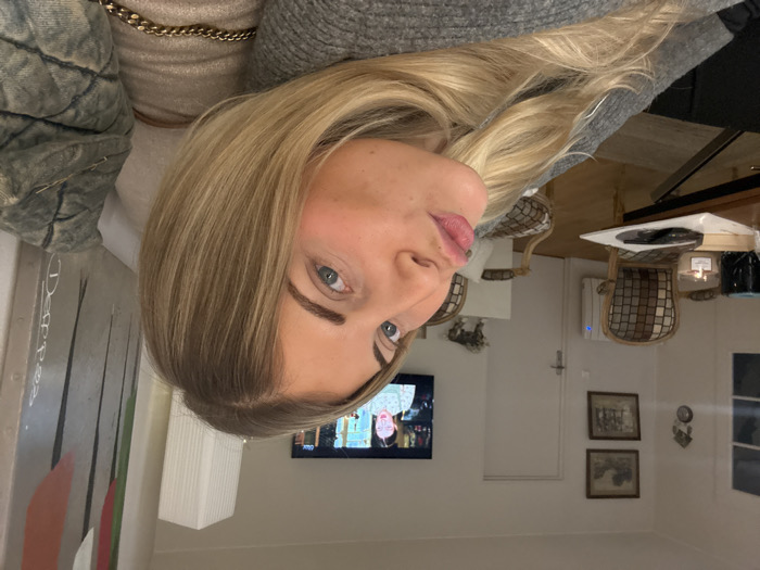 A woman with blonde hair, light skin, and blue eyes poses indoors