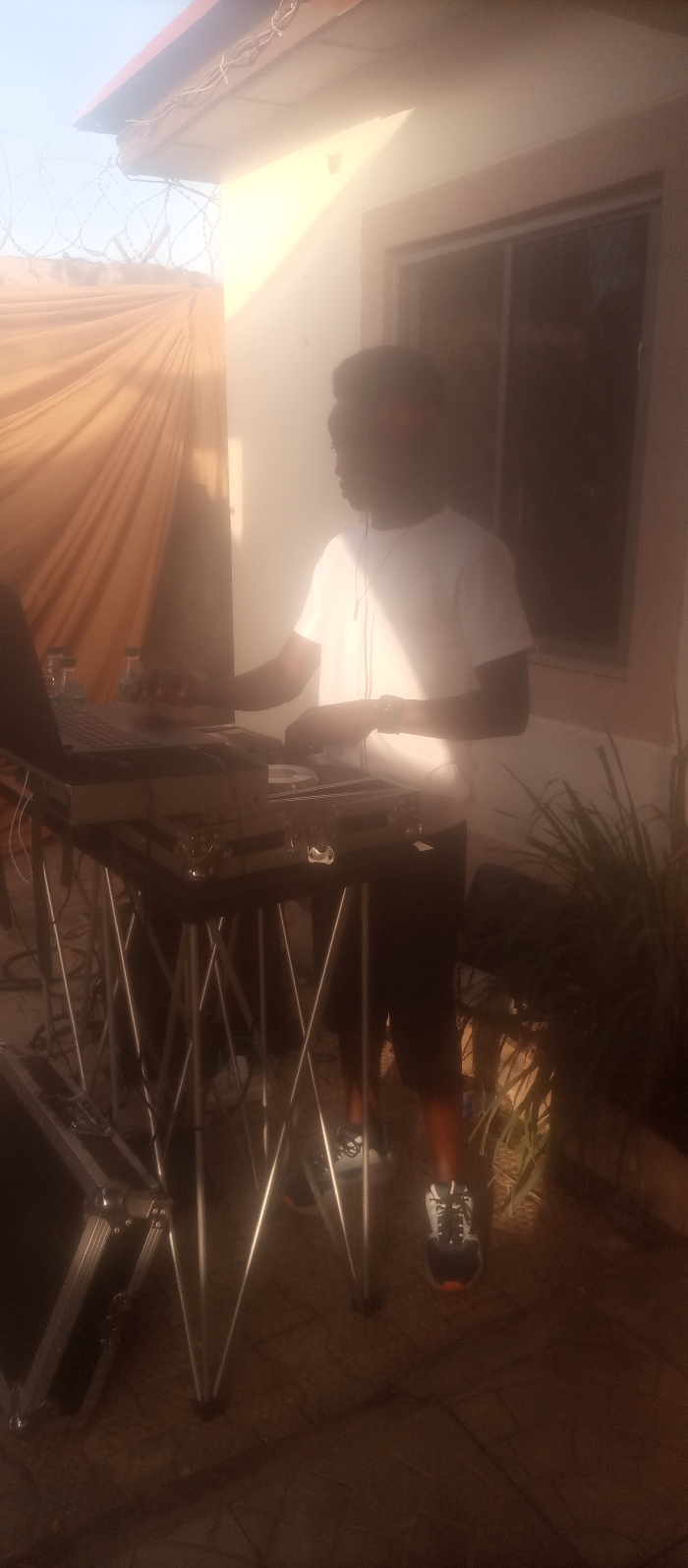 The image portrays an outdoor event setup in Sabon Tasha, Nigeria, under natural daylight with strong sunlight causing overexposure in parts of the frame. A male individual, appearing to be an adult, stands in the center operating DJ equipment. He wears a white short-sleeved t-shirt, dark shorts, and athletic shoes with blue and orange accents, and is equipped with white wired earphones. His hands are positioned over a silver DJ controller and a silver laptop, both resting on a black surface atop a portable metallic stand with crisscrossing legs. Two clear plastic bottles are visible next to the laptop. To the lower left, a black equipment case with silver edges is on the ground. The background to the left features a large light brown draped fabric structure, with barbed wire fencing visible above it against a clear blue sky. To the right, a light-colored building wall with a dark-framed window is visible. A potted plant with long green fronds is situated in the lower right. The scene is illuminated by direct sunlight, casting shadows and creating bright highlights.