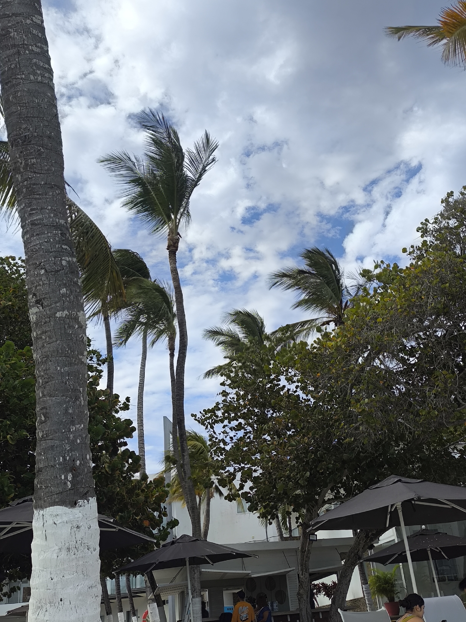 The scene is an outdoor view in El Yaque, Venezuela, featuring a mix of natural and built elements. The foreground is dominated by a thick tree trunk, painted white at the base, likely as a border marker. Several palm trees are scattered throughout the scene, with the tallest one in the center, its fronds swaying in the breeze. Dense green trees and shrubs fill the middle ground. Several black umbrellas shade tables and chairs in the background, suggesting a patio or outdoor dining area. People are visible beneath the umbrellas. A multi-story white building is partially visible behind the greenery. Above, a cloudy sky with patches of blue is present.