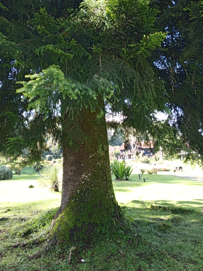 A large tree dominates the foreground, its trunk covered in moss near the base. Green needles form a dense canopy overhead. Beyond the tree, a well-maintained lawn stretches out. Scattered plants and shrubs dot the landscape, leading to a large house or building in the distance. Sunlight filters through the tree's branches, casting shadows on the grass.