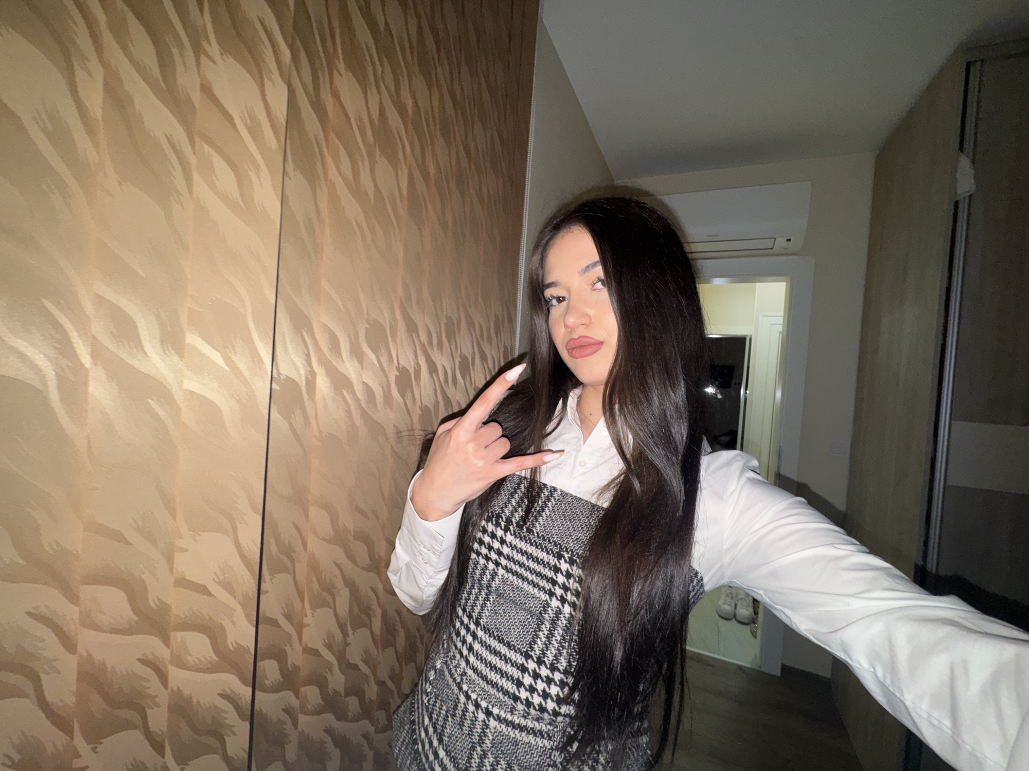 The image depicts a female subject in an indoor setting, purportedly located in Plovdiv, Bulgaria. The photograph is oriented 90 degrees clockwise. The subject has long, dark hair, light-colored eyes, and prominent lips, which appear to have a pinkish-red product applied. She is wearing a white collared shirt beneath a black and white patterned (houndstooth or similar) sleeveless garment. Her right hand, from the viewer's perspective, is raised and positioned near her head, forming a "rock on" gesture with the index and pinky fingers extended. Her fingernails are long and appear to be manicured with a light color. Her gaze is directed towards the camera, and her mouth is slightly open. The upper background features a textured wall with a wavy, light brown or beige pattern. The lower background is darker and less defined, revealing a partial view of what appears to be a window or reflective surface to the subject's left, reflecting an interior with white elements and possibly a pair of white shoes. Below this, a light-colored, possibly wooden or laminate, surface is visible. The lighting suggests an artificial indoor environment.