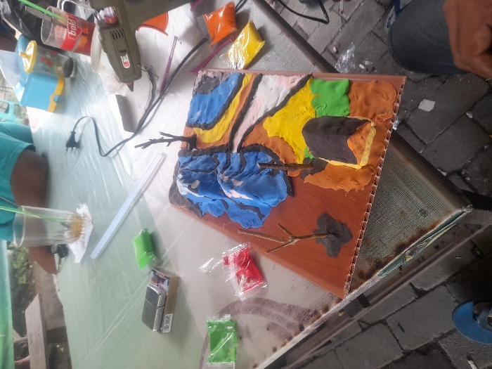 The scene depicts an outdoor or semi-outdoor casual area in Kecamatan Pati, Indonesia. A rectangular table, covered with a light green plastic tablecloth, occupies the central foreground. The table rests on a paved surface composed of grey interlocking bricks. A rectangular craft project, fashioned from multi-colored modeling clay on a brown corrugated plastic board, is central on the table. This project depicts a landscape with blue clay formations resembling mountains or water, alongside yellow, orange, and light brown clay masses forming terrain and a dark brown/black mound suggestive of a cave or hill. Two bare, twig-like elements are embedded in dark clay bases, positioned as trees on the left and right sides of the landscape. To the left of the project, a chrome-plated Zippo-style lighter rests on a small cardboard box. Nearby are three transparent plastic bags containing modeling clay: one with bright green clay near the lighter, and two more, one with bright green and another with bright red clay, further left. To the right of the project, an olive-green hot glue gun with a clear glue stick is positioned alongside several colored plastic wires in pink, purple, yellow, and orange. Two transparent plastic bags containing bright orange and bright yellow modeling clay are also present. Other items on the table include a clear glass with an amber liquid and two green straws on a white coaster, a black electrical plug and cable, a light blue and yellow plastic tissue dispenser, and a second glass with a red "bold" label containing a dark beverage. Two individuals are partially visible. On the lower left, a foot wearing a blue flip-flop is visible on the pavers. On the lower right, a person's right hand and knee, clad in dark pants, are visible. In the background, a person wearing a light blue short-sleeved top is seated at the table. A wooden bench or table and green foliage are visible in the distant background.