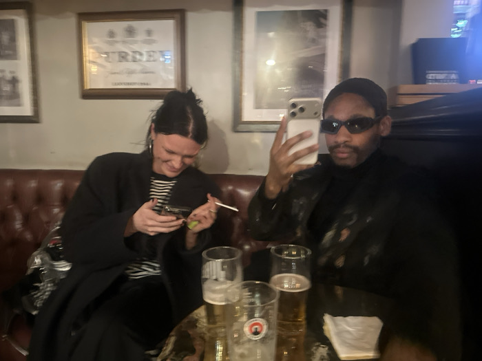 Two people sit on a brown leather couch in a pub. A woman with dark hair pulled back and wearing a black coat holds a phone and a cigarette. A man in a black beanie and sunglasses takes a selfie with his phone. Two glasses of beer are on the table in front of them, along with a white napkin. Several framed pictures hang on the wall behind them.