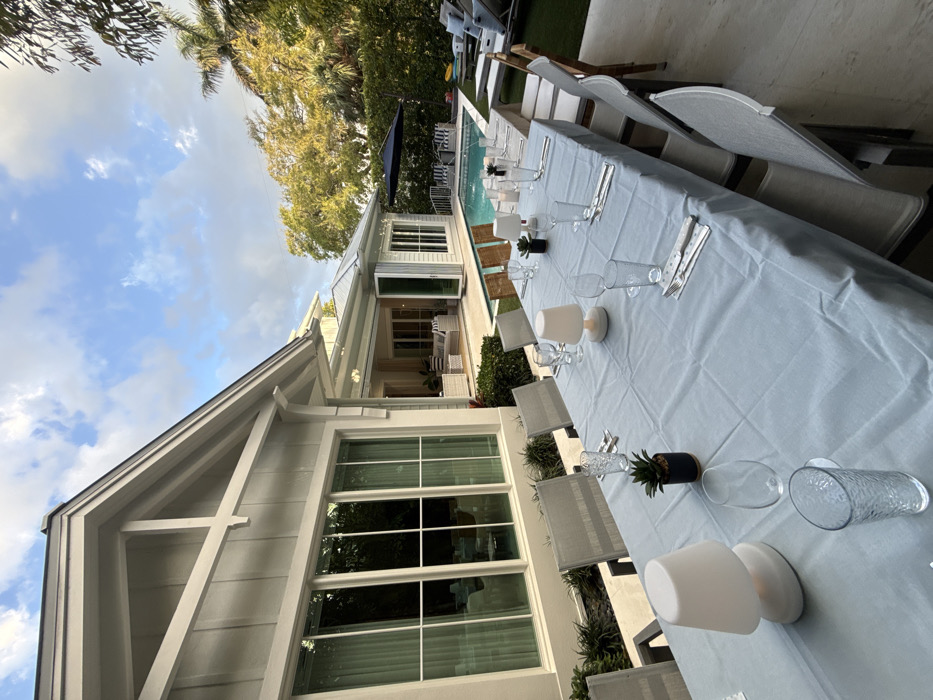 The image depicts an outdoor dining and poolside area of a modern residence located in Naples, Florida, United States. A long, rectangular dining table, covered with a light blue tablecloth, is set in the foreground for approximately 12-14 guests. Each place setting consists of a plate, a clear drinking glass, a clear wine glass, a fork, and a knife. Small white portable lamps and potted succulent plants are interspersed along the table as centerpieces. The table is flanked by light grey outdoor dining chairs. Behind the dining table, a rectangular swimming pool with a visible water jet feature is surrounded by light-colored paving. Several dark lounge chairs with light cushions and a large dark blue cantilevered umbrella are positioned poolside. The adjacent two-story house, exhibiting modern coastal architecture, features light grey horizontal siding, white trim, and large, white-framed windows. Bi-fold doors on a section of the house are open, revealing an interior living space furnished with white outdoor seating. Lush tropical vegetation, including palm trees and dense green foliage, frames the perimeter of the property. The scene is illuminated by natural light under a partially cloudy blue sky. No individuals are present.