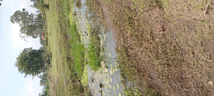 This image displays a daytime scene in Kisumu, Kenya, encompassing a transitional landscape between marshland and developed areas. The immediate foreground consists of uneven, light-brown earth with sparse, dry, and some nascent green vegetation. A shallow, narrow water channel or ditch, oriented horizontally across the midground, is densely populated with aquatic vegetation including circular green lily pads floating on the surface and numerous upright, slender green reeds. The water itself appears dark and still. Beyond the channel, the background features an open field with similar low-lying green and brown vegetation. Prominent in the background are a large, full-canopied tree with dark green foliage on the left, and a cluster of tall, slender trees, possibly eucalyptus, on the right. Further behind these trees, structures are visible, including at least one building with a reddish-brown tiled roof and light-colored walls. The sky above is light blue with scattered white clouds. No individuals, animals, or active human interactions are depicted within the scene.