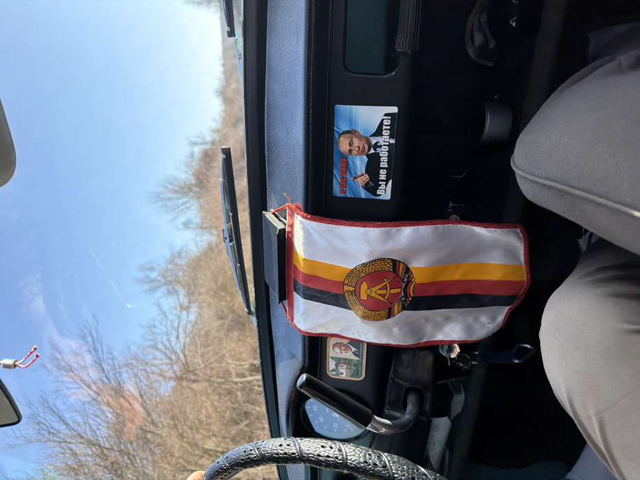 The image depicts the interior of a vehicle, viewed from a slightly elevated perspective, looking forward through the windshield, with the scene located in Idilevo, Bulgaria. The driver's left hand, covered by a black, textured steering wheel, is visible on the left side of the frame. The driver's lower torso and legs, clad in light grey trousers, are seen in the lower foreground. The vehicle's dark-colored dashboard occupies the middle ground. Adorning the dashboard are several items: a small white, black, red, and yellow vertical banner with the coat of arms of the German Democratic Republic (GDR) centrally embroidered, hangs from the windshield area. To the immediate left of this banner is a small framed picture depicting an older man in a suit, likely Georgi Dimitrov, with a building in the background. To the right, a rectangular sticker displays an image of Vladimir Putin pointing, accompanied by two lines of Cyrillic text: "И У ВАС ВИНКИ!" and "ВЫ НЕ РАБОТАЕТЕ!". The second line translates to "You are not working!". A small black rectangular object rests on the dashboard near the base of the windshield. Keys with a blue carabiner hang from the ignition area below the dashboard. Through the windshield, a clear, light blue sky is visible above a landscape of deciduous trees with bare branches, suggesting a season like late autumn or winter, under bright daylight conditions. Two windshield wipers are visible at the base of the windshield in their resting position.