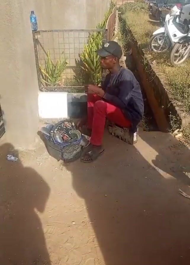 A young man wearing a blue shirt, red pants, sandals, and a black baseball cap sits on a block of concrete near a building wall. To his left is a black plastic container with various items inside, including what appear to be glass or plastic bottles. The man is looking down and reaching into the container. Another person walks past him on the right side of the frame, wearing a dark brown robe and sandals. Behind the seated man is a low metal fence and some greenery. In the background, there are parked motorcycles and cars. The ground is dirt and concrete. A water bottle is precariously perched on top of the wall next to the fence.