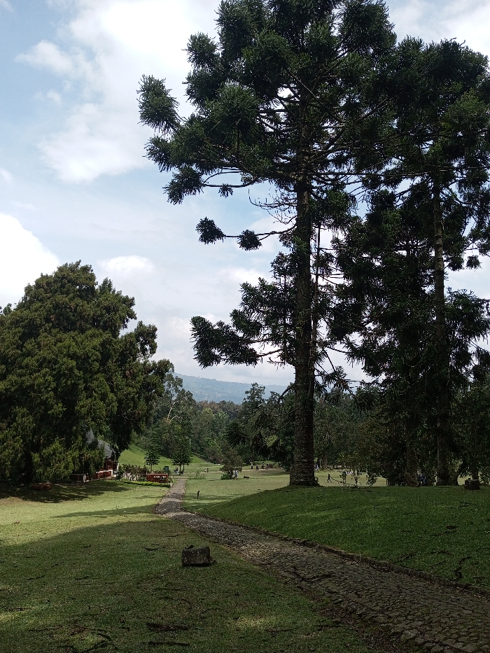 A scenic view showcases a stone path cutting through a lush green lawn, leading towards a distant forest. Tall, coniferous trees with dark green foliage dominate the landscape on the right, casting shadows. On the left, a large, rounded tree stands near a building and several picnic tables. Gentle hills are visible in the background under a partly cloudy sky. The overall composition gives a sense of peace and tranquility.