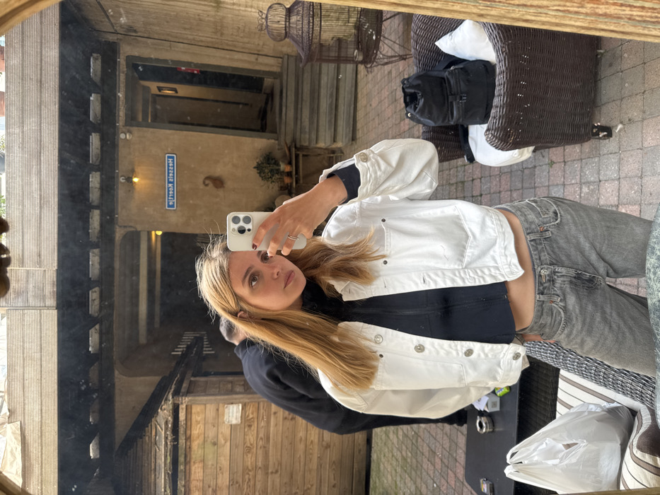 A young female, with light brown hair parted centrally, is captured in a mirror selfie within an outdoor courtyard. She wears a black long-sleeved top, a cropped white denim jacket with button closures, and faded grey jeans. Her right hand holds a white iPhone, used to capture the image, with her fingers exhibiting dark red nail polish. A silver-toned ring is visible on her left ring finger. The reflected environment is a brick-paved courtyard with reddish-brown pavers. To the left, a person in a black garment is partially visible, facing away from the mirror, near a wooden structure composed of horizontal planks. In the foreground on the left, a dark rectangular outdoor table holds a silver lighter, a small white plastic container, and another indistinguishable object. Adjacent to this, a white plastic shopping bag rests on a striped cushion placed on a wicker outdoor seating element. The background features a light brown or tan stucco wall. Centrally, a reversed blue street sign reads "Kootje Lezzels." Below this sign, a small wooden table displays several potted plants. To the right, a large, ornate, dark brown metal birdcage on a stand is positioned next to a brown wicker armchair, which holds a black drawstring backpack with a front zippered pocket and a white cushion. An open doorway with steps leading upwards is visible in the far background. Above the scene, a wooden slatted roof or balcony structure is present. The entire scene is located in the courtyard of Kootje Lezzels Bar & Grill, Sint-Jakobsstraat 19, Bruges, Belgium.