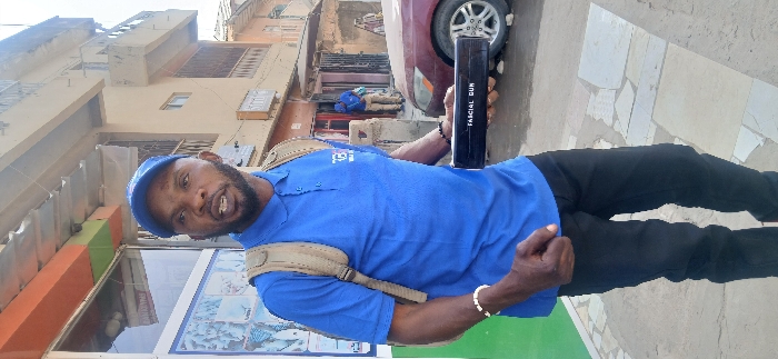 An adult male is prominently featured in the foreground, standing on a paved sidewalk in Sabon Gari West, Nigeria. He possesses a dark complexion, short dark hair, and a trimmed beard. He wears a blue short-sleeved polo shirt with a white logo on the left chest, a blue baseball cap, and black trousers. A tan backpack is worn over his shoulders. A white beaded bracelet adorns his left wrist, and a dark beaded bracelet is on his right wrist. His mouth is open, indicating speech. He holds a black rectangular box, approximately 10-12 inches long, with the words "FASCIAL GUN" printed in white on its visible side, in his right hand. In the mid-ground, to the right, a red sedan is partially visible, parked with its front bumper and front wheel directed towards the viewer. Further in the background, another adult male, also wearing a blue shirt and light-colored trousers, is standing near a building. The street features multi-story buildings with balconies, consistent with an urban setting. The immediate environment includes a storefront with a glass display and an orange and green striped awning to the left of the foreground subject. The ground is paved with irregular light-colored tiles. The scene is illuminated by daylight.