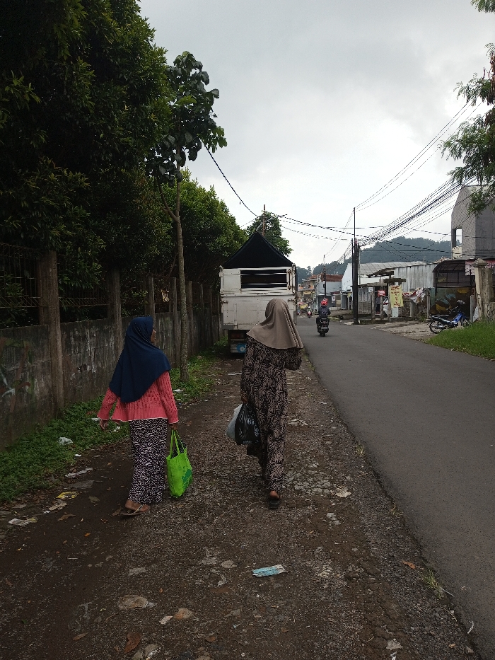 Two women are walking away from the viewer on a narrow path alongside a road. The woman on the left wears a blue hijab, pink top, and patterned skirt, carrying a green bag. The woman on the right wears a hijab and patterned jumpsuit, holding a dark plastic bag. A white truck with a dark roof is parked on the side of the road. In the distance, a person on a motorbike rides down the road. Buildings and power lines are visible in the background under a cloudy sky.