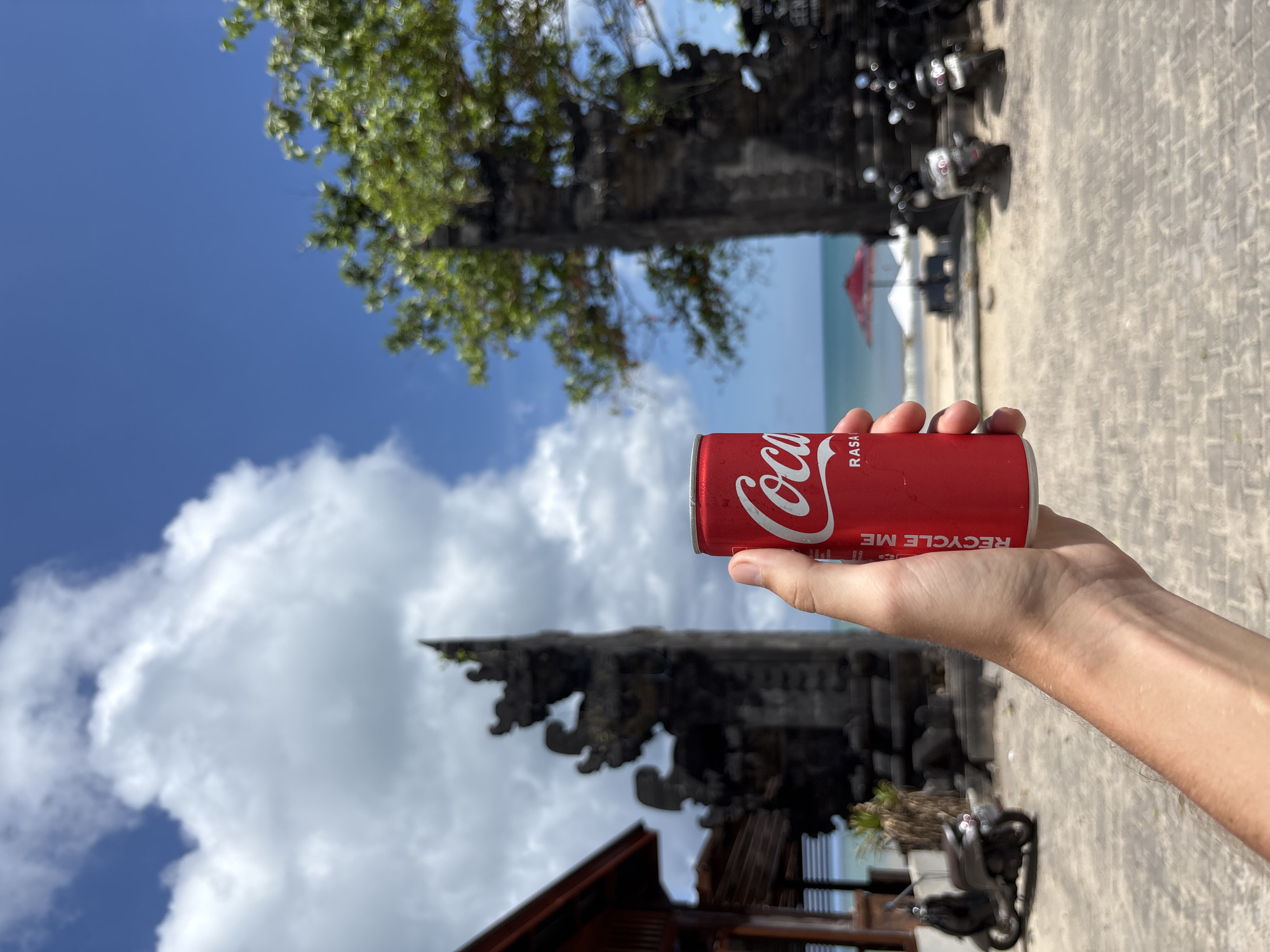 A hand holds a red Coca-Cola Rasa Raspberry can in front of a beach scene in Jimbaran, Indonesia