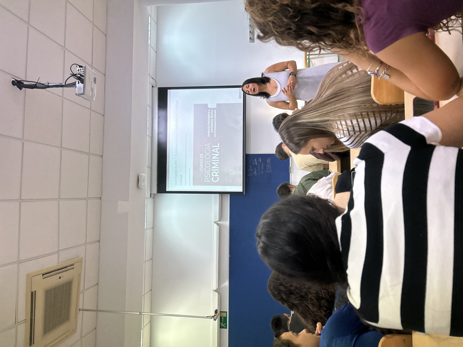 The image depicts an indoor classroom in Jerez De La Frontera, Spain. The scene features a female instructor addressing approximately twelve students seated at wooden desks. The instructor, positioned at the front-right of the room, is a woman with dark hair, wearing a light-colored, sleeveless dress. Her mouth is open, indicative of speaking, and her hands are raised and slightly open. A white projection screen to her left displays text in Portuguese, prominently featuring 'CURSO DE PSICOLOGIA CRIMINAL' (CRIMINAL PSYCHOLOGY COURSE), with additional text identifying it as 'Guia Rápida de APA 7: Fundamentos para Estudantes de Psicologia Criminal' and 'Avaliação Psicológica e Perícia Técnica em Processos Criminais.' A white projector is mounted from the ceiling directly in front of the screen. Students occupy the midground, seated in rows. In the immediate foreground, the back of a person wearing a black and white striped shirt is visible. To their right, the arm of a person in a purple shirt rests on a wooden desk, displaying a silver bracelet and a dark mobile device. A female student with long, light brown hair, wearing a striped shirt, is visible in profile, looking towards a male student seated to her left. Other students are primarily visible from behind, facing the front. The classroom features a two-tone wall, with a dark blue lower section and a white upper section. An emergency exit sign with a green pictogram is mounted on the blue wall. White acoustic ceiling tiles cover the ceiling, from which a square, recessed air conditioning unit is suspended in the upper left, and fluorescent strip lights are visible along the upper wall sections. Blue writing is present on a whiteboard or similar surface to the left of the projection screen.
