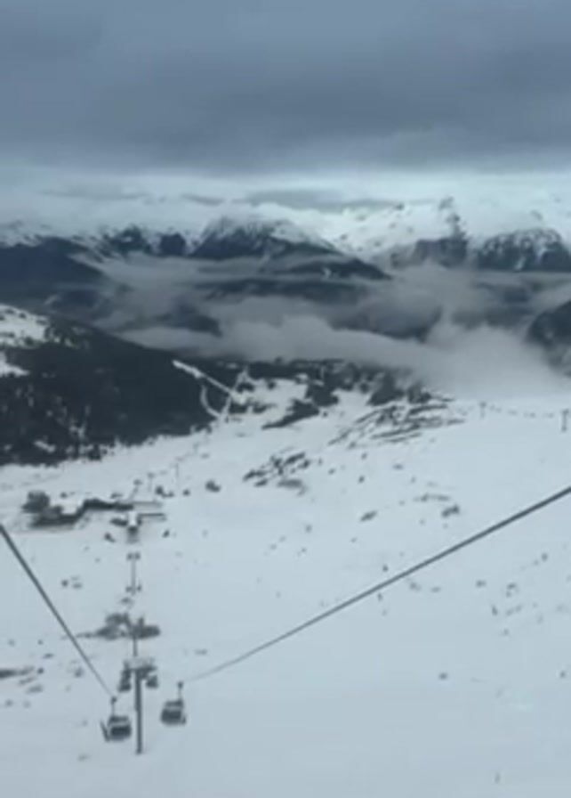 snowy mountain landscape from the perspective of someone on a ski lift. In the distance, snow-capped mountains are partially obscured by clouds. The ski lift and its cables are visible, with empty chairs moving along the line. The ground is covered in snow, and there are some buildings and ski runs visible below. The sky is overcast and grey.