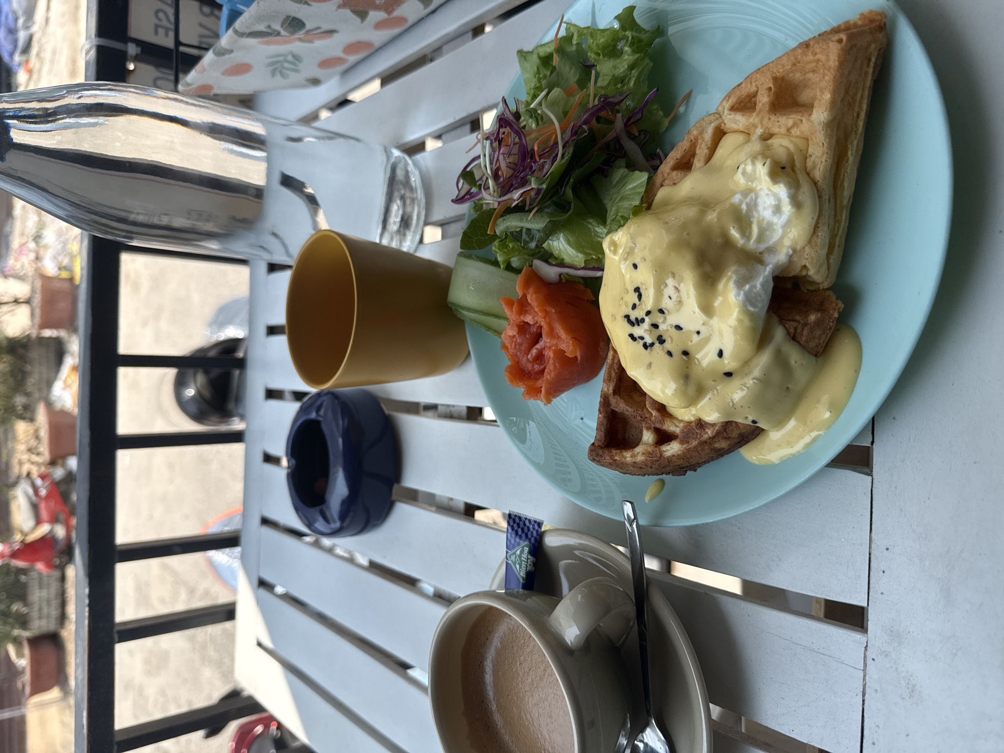 The image depicts a meal on a white slatted table, likely in an outdoor setting, based on the obscured urban view in the background. The food consists of a waffle topped with what appears to be a poached egg and hollandaise sauce, garnished with black sesame seeds. A side salad with mixed greens and shredded red cabbage, alongside a piece of cucumber and smoked salmon, complements the main dish. A cup of coffee is present, with a sugar packet resting on the saucer. A water bottle, a mustard-colored glass, and a dark blue ashtray are also on the table. Given the query specified the location as Bắc Nha Trang, Vietnam, the setting is likely a café or restaurant there.